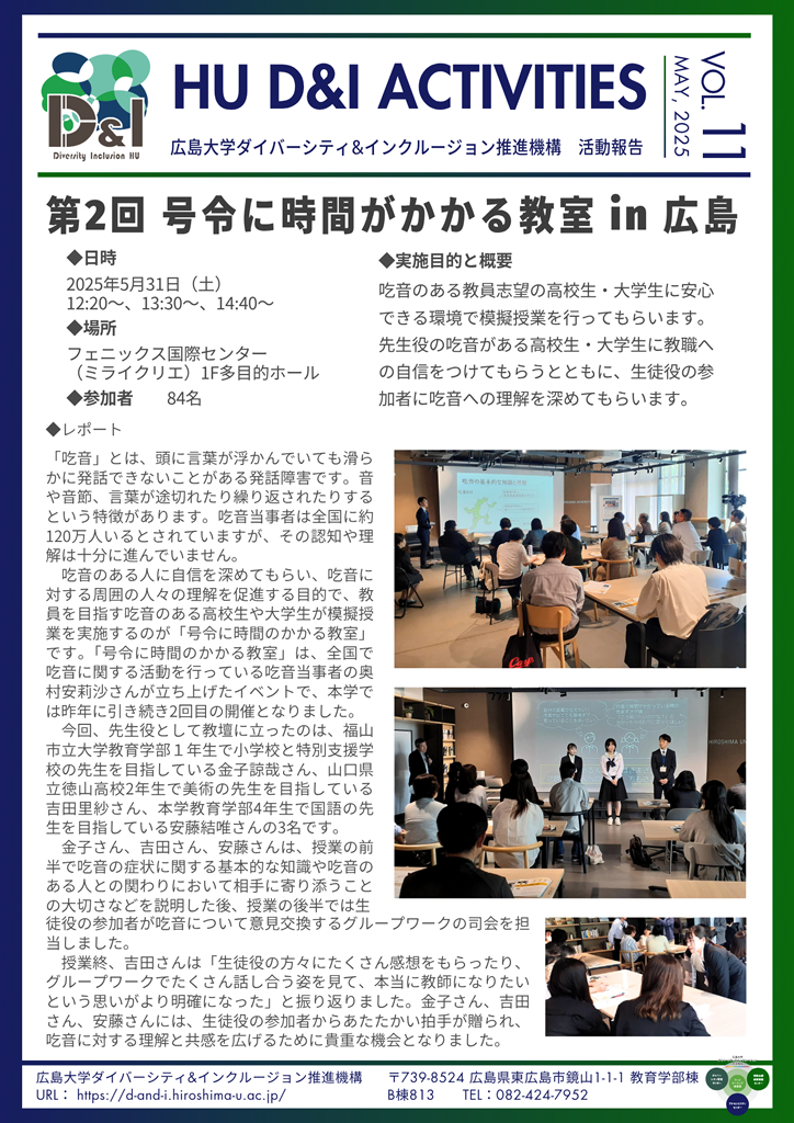 吃音のある人に自信を深めてもらい、吃音に対する周囲の人々の理解を促進する目的で、教員を目指す吃音のある高校生や大学生が模擬授業を実施するのが「号令に時間のかかる教室」です。「号令に時間のかかる教室」は、全国で吃音に関する活動を行っている吃音当事者の奥村安莉沙さんが立ち上げたイベントで、本学では昨年に引き続き2回目の開催となりました。