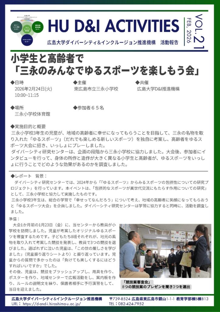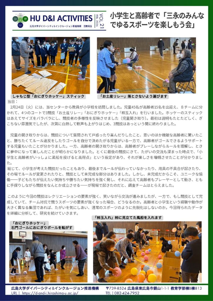 三永小学校3年生は、総合の学習で「幸せってなんだろう」について考え、地域の高齢者に笑顔になってもらおうと「ゆるスポーツ大会」を企画しました。ダイバーシティ研究センターは学習に協力すると同時に、活動を調査しました。